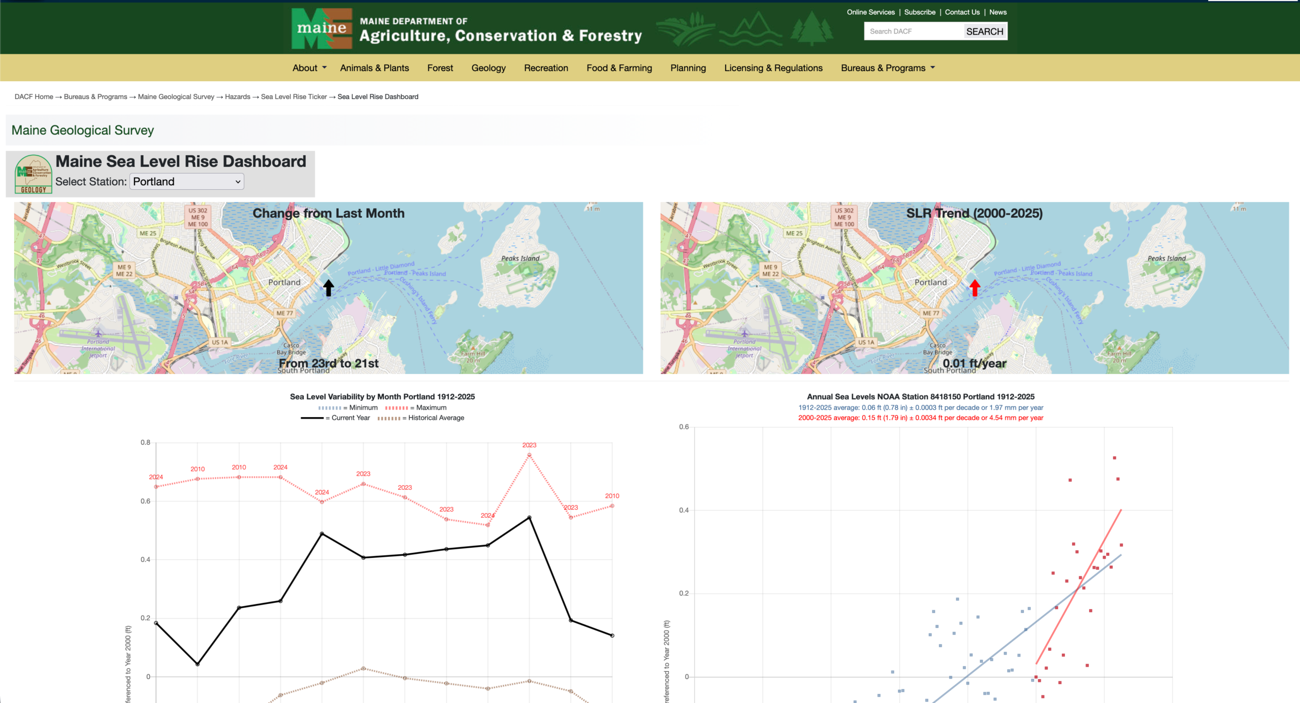 This site tracks water level trends at 5 Maine tide gauges from the early 1900s, and short-term sea level rise since 1993 based on satellite data.