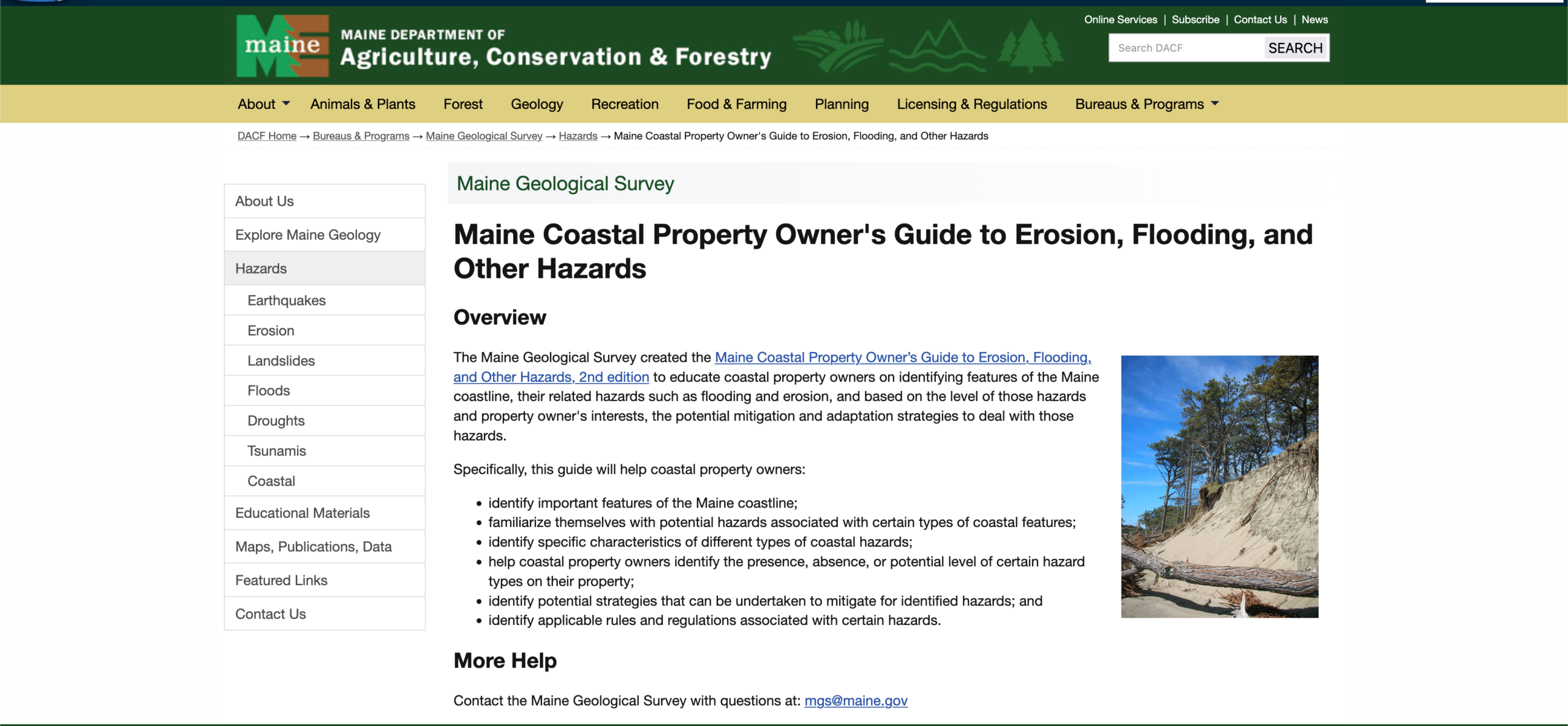The Maine Geological Survey equips coastal property owners with tools, maps, and guidance to address the growing risks of erosion, worsened by higher seas and higher storm surge. Resources include bluff stability and living shorelines suitability maps, sea level rise tracking tools, living shoreline case studies, and model ordinances. MGS also partners with communities and residents to monitor shoreline change, helping property owners plan for and adapt to a shifting coast.