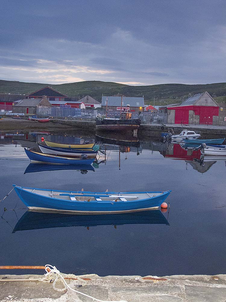 This was the first time we had seen the sun since arriving in Scotland three days earlier. I knew from the guidebooks that the sun can be particularly elusive in Shetland, so I continued my exploration of Lerwick after dinner. By now it was about 10 p.m., and the sun had been slowly setting for hours. The light was indescribably beautiful as I walked through various neighborhoods, eventually ending up at a working waterfront.