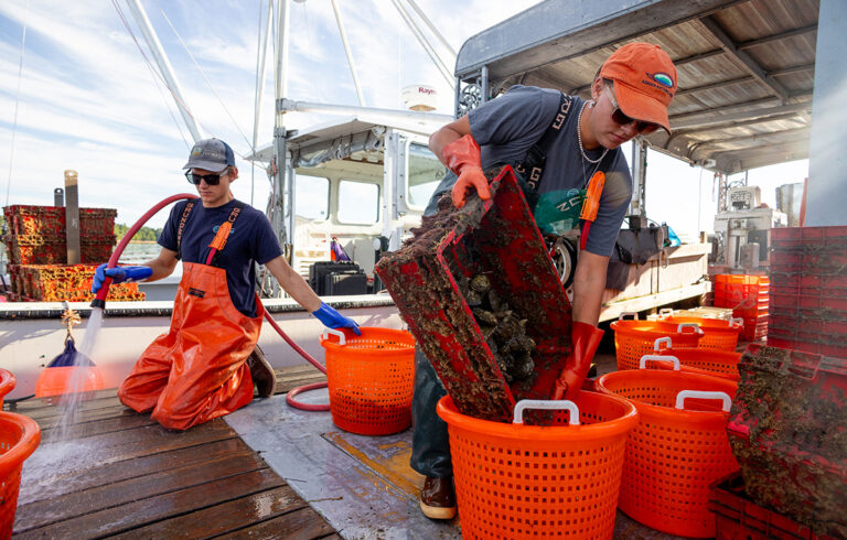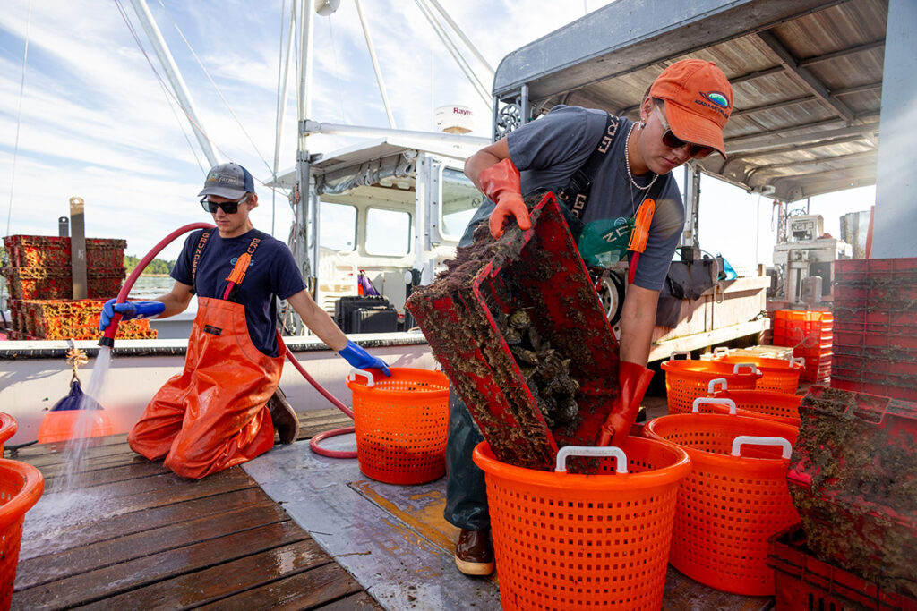 Now several years into running an oyster business, Leathers and Oransky name environmental sustainability as a top priority. As such, they became innovators in the aquaculture industry and are owners of Heron, one of the first fully electric aquaculture vessels in the state.