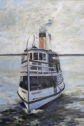 Through it all, she cranked out painting after painting, primarily in acrylic, creating a historical artistic view of ferries in Casco Bay—with names like the Abenaki, the Berkley, the Emita, the Island Romance, the Tourist, to name just a few. One of her favorites, which hangs in their home, shows the Gurnet, a picturesque wooden steamer that was built more than a century ago and ran in Casco Bay until 1964, when it was damaged in a fire.