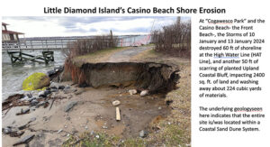The story begins in January 2024. Two severe storms battered the island, eroding 60 feet of shoreline along Casino Beach. The waves washed away the community’s golf cart parking area and washed out the road connecting the island to its public dock.