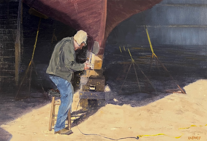In the painting, the determined boat restorer handles a vintage Stanley electric plane that sends shavings into the air. He stands astride a stool, his head bent to the work, the sloop looming over him.