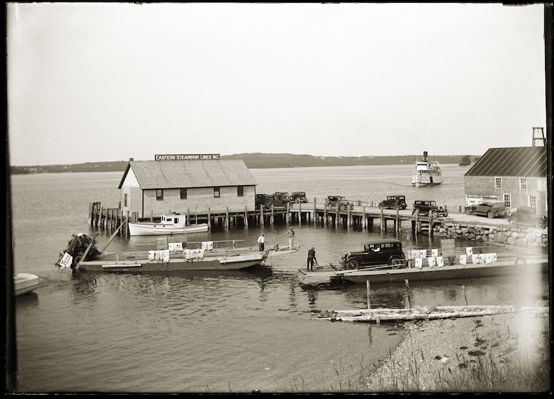This photo displays the rural community that thrived here before the Deer Isle Bridge. In the foreground are two of Captain Charles Scott’s car ferries. His family ran this transportation business, shuttling people and vehicles between Sedgwick and Deer Isle for more than a century. The one on the right is ready to head to the island with a 1927 or 1928 Chevrolet, while an arriving ferry has a dredging machine hanging off the rear, no doubt a useful machine when dealing with shifting sediment. Each ferry is equipped with numerous life jackets hanging on the rails.